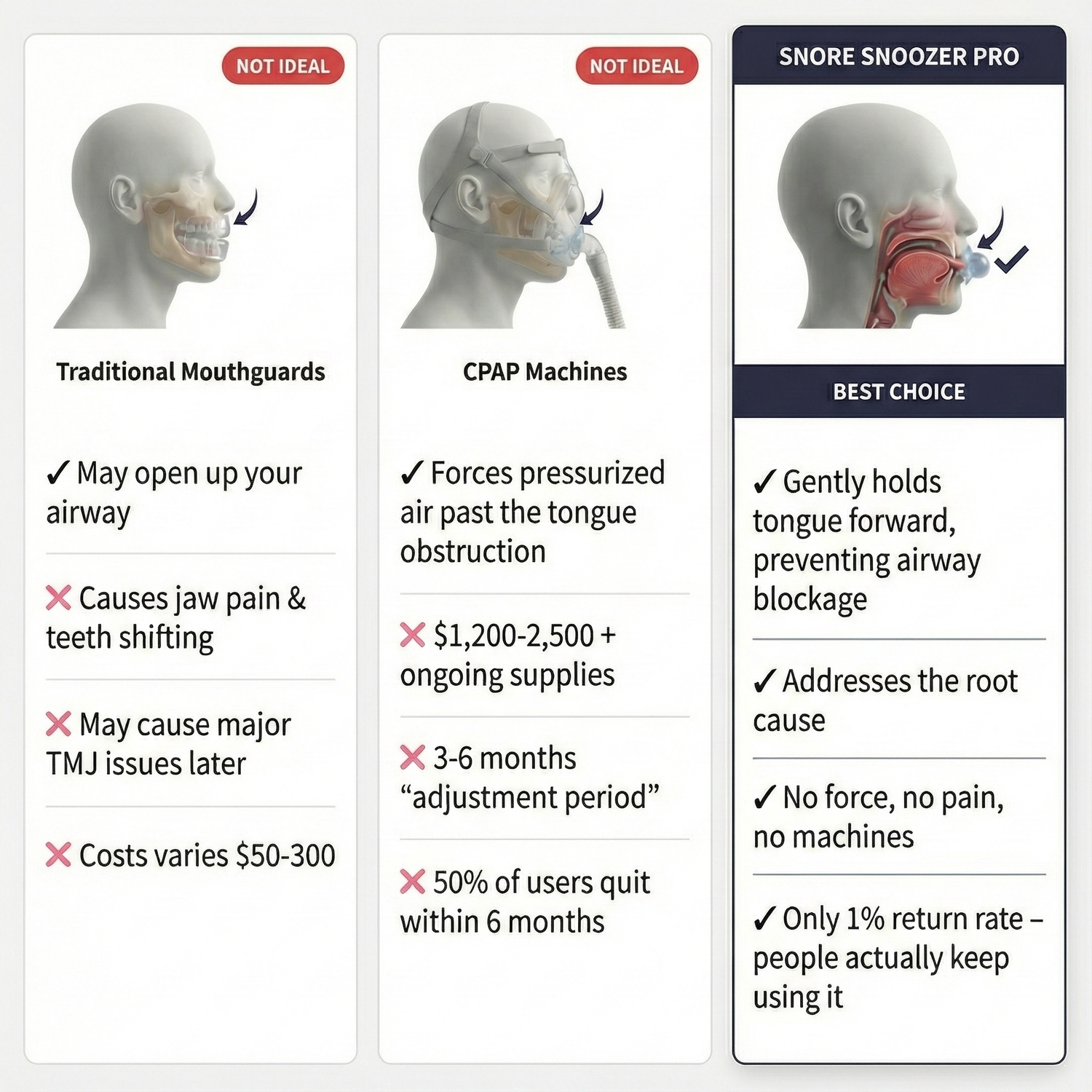 SnoreSnoozer Pro is the only solution that targets the root cause—tongue position—without force, discomfort, or working against your body's natural breathing.