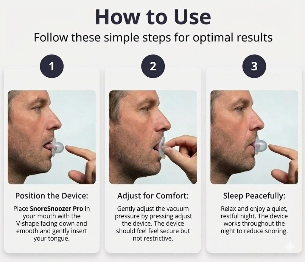 👉 SnoreSnoozer uses a soft suction bulb to keep it forward, opening your airway all night.